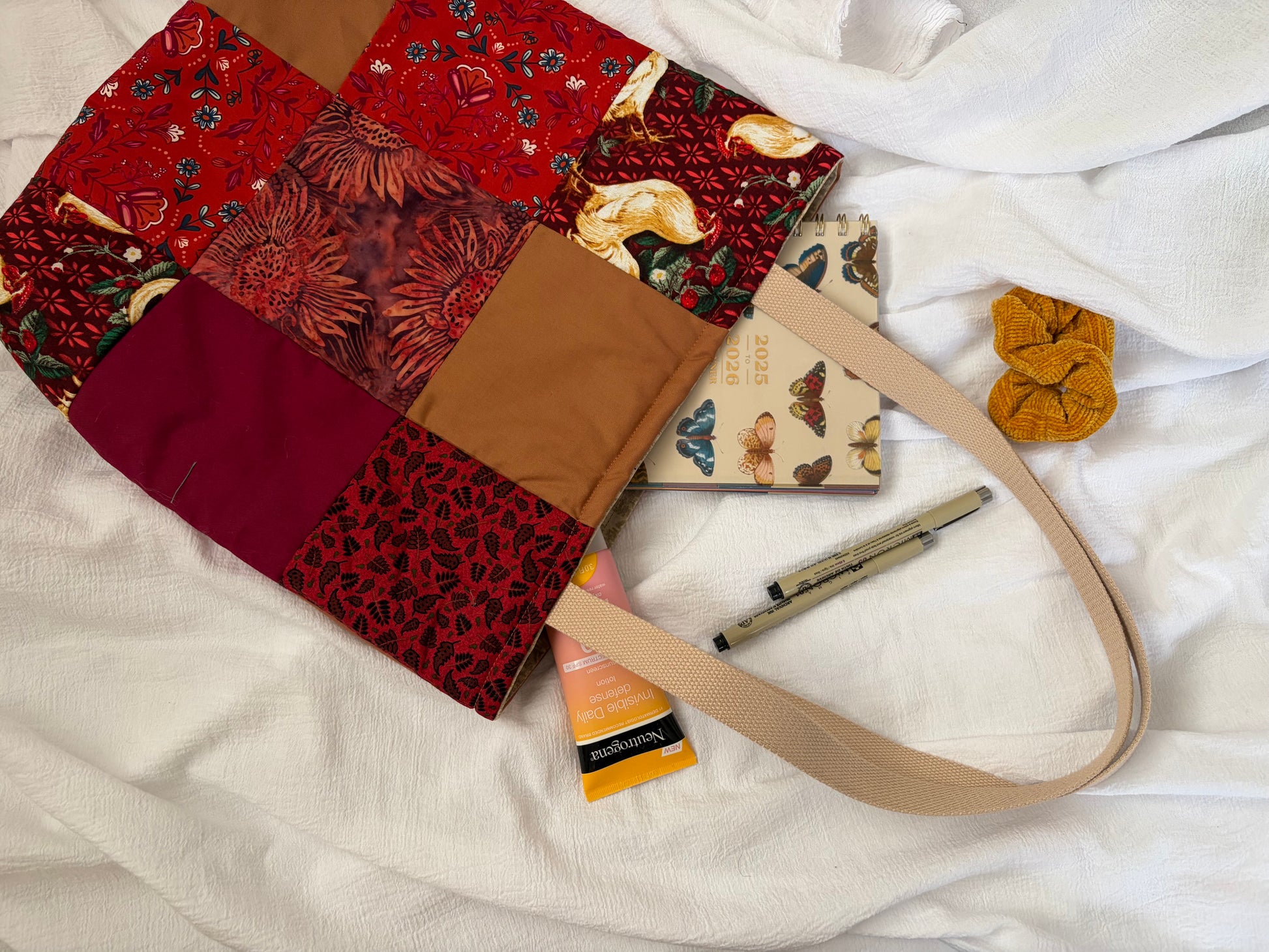 This versatile quilted tote is just the right size for craft projects, books, tech, and daily essentials. Measuring 15" × 15" with a 3" gusset, it’s easy to carry, yet roomy enough to hold what you need without feeling bulky.